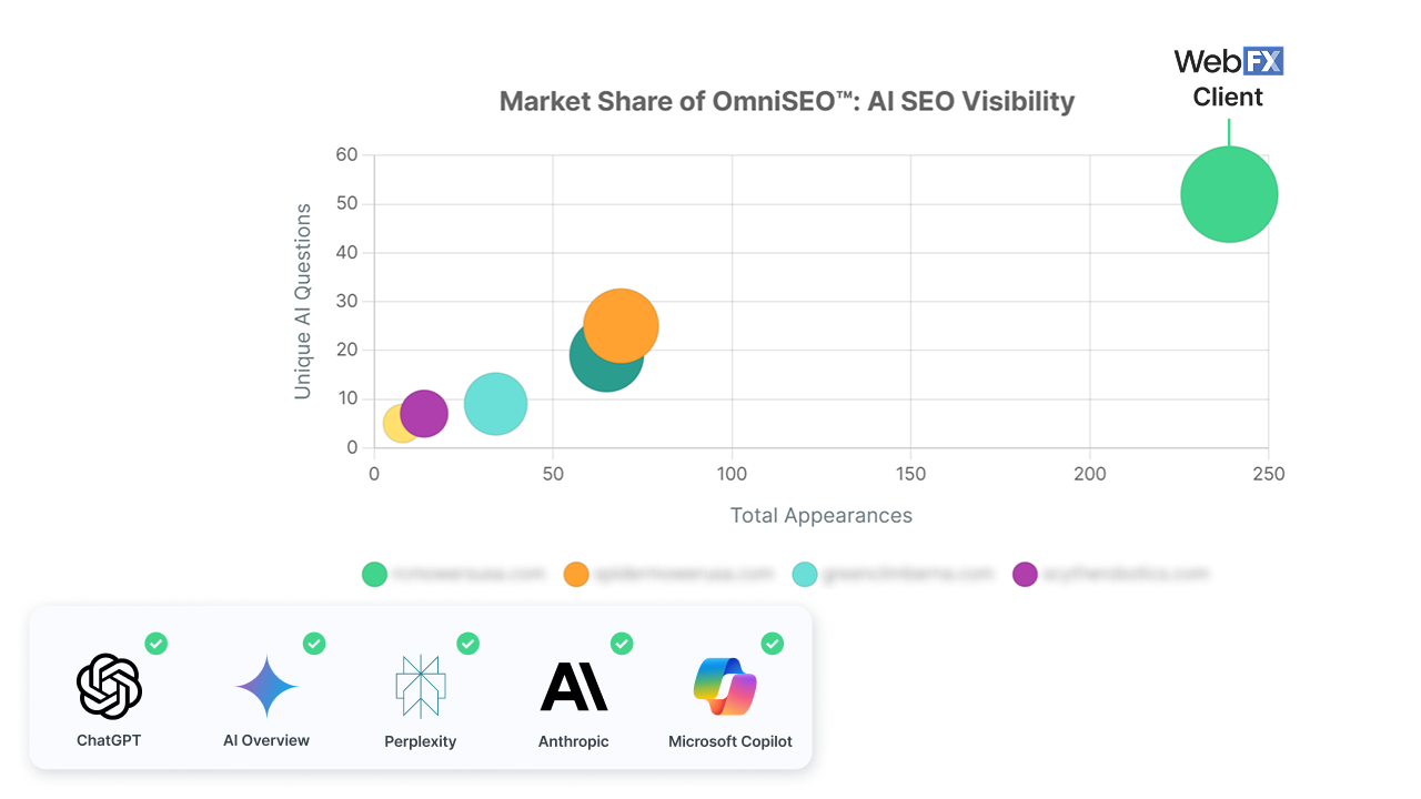 This client didn’t wait for generative AI to disrupt their industry — they moved first. While others stayed focused solely on traditional SEO, they partnered with WebFX to explore how AI search could expand their reach and influence early-stage buyer research. With OmniSEO®, they didn’t just gain visibility across platforms like ChatGPT and Perplexity — they secured a measurable edge in the competitive world of commercial landscaping equipment.