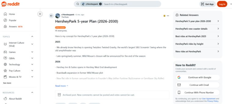 Pas tout à fait - il est entièrement dérivé de TheShaiv, un utilisateur de Reddit qui a lancé un fil de discussion décrivant son concept de ce que pourrait être le plan quinquennal de Hershey Park. Oui, un plan hypothétique sur 5 ans d'un utilisateur aléatoire (et très créatif) de Reddit.